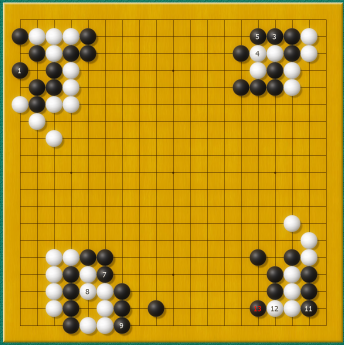 比如下面这个图,双方都只有3口气,谁先收气,谁就可以吃掉对方。